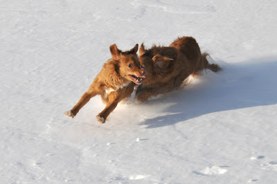 Marsa on aina tykännyt ihan hirveästi hakuruudusta, joten tein vielä autolle kävellessämme metsään pienen ruudun. Lumi ei kantanut minua, mutta Marsa käveli sen pinnalla ihan vaivattomasti. Menin siis vähän matkaa yli polven olevassa hangessa kahlaten ja sitten vain kylmästi heitin damin kauas.